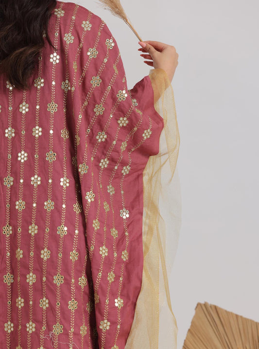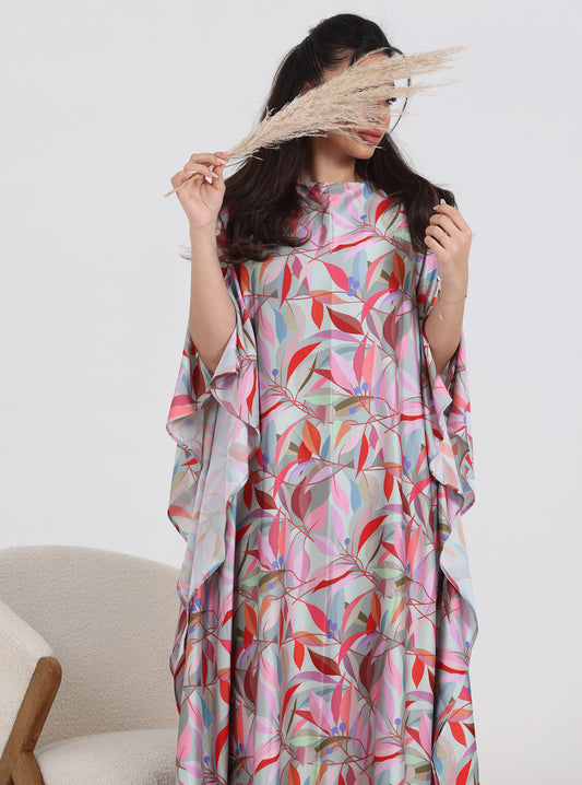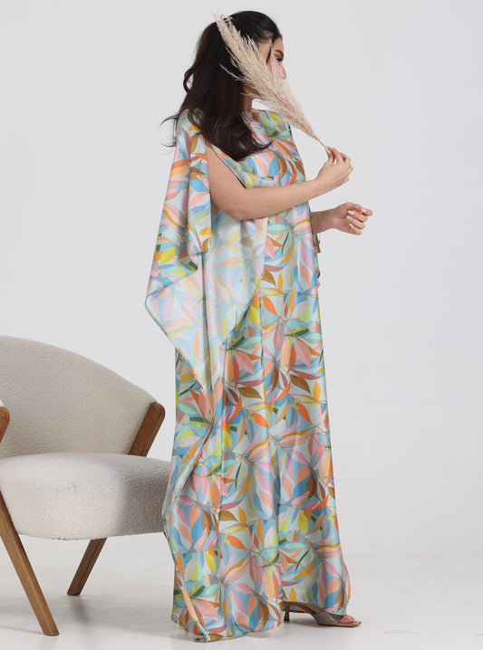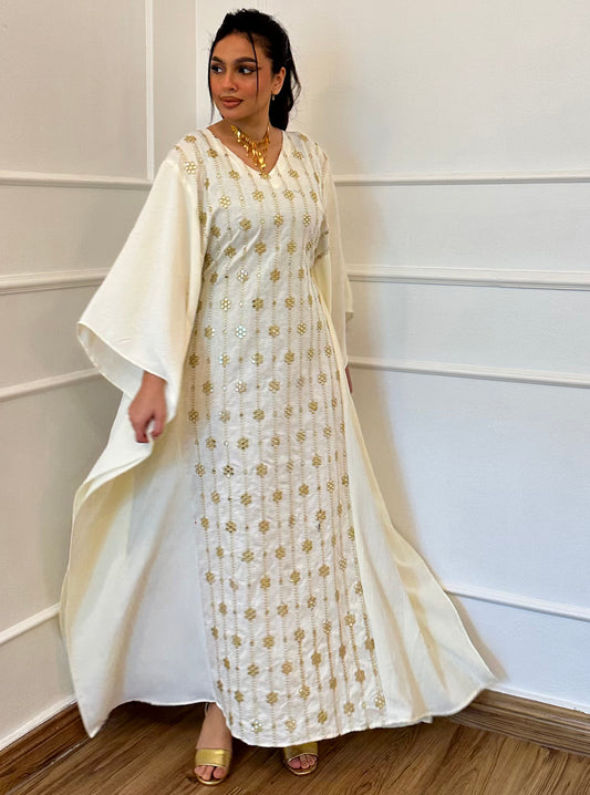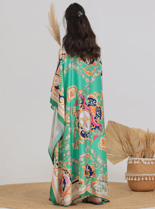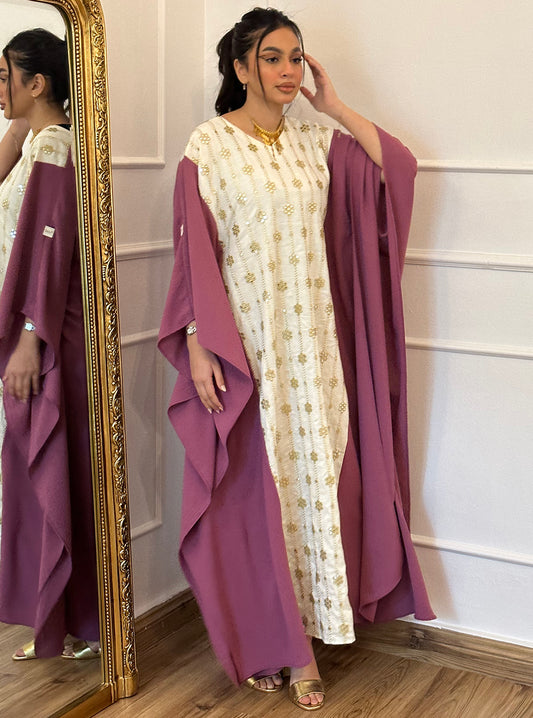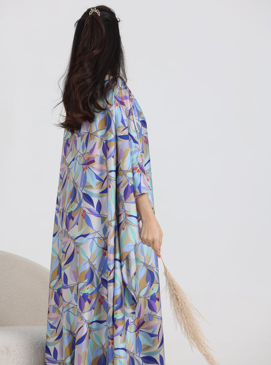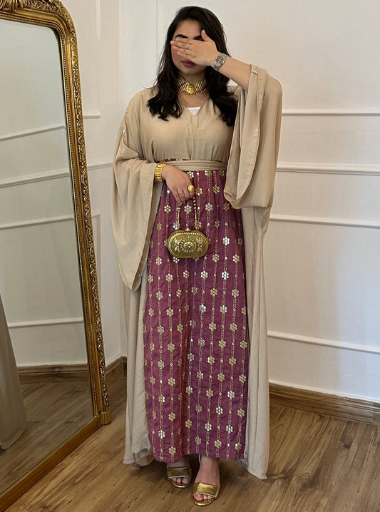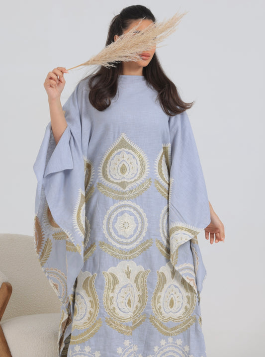 N037 - Tiffany and fuchsia linen kaftan with golden front embroidery